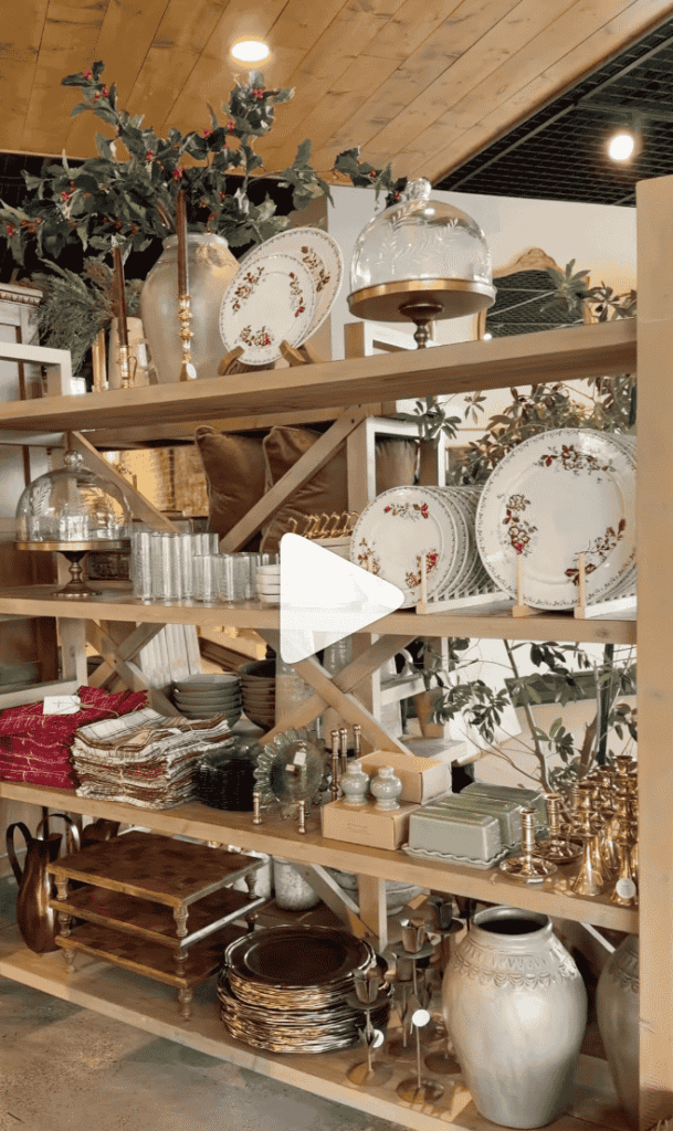 Joanna also showed off open shelving loaded with holiday serveware and décor. Stacks of plates with red floral patterns sit beside glass cloches, brass candlesticks, linens in checks and plaids, and ceramic pieces in muted greens. The scene feels like the behind-the-scenes of a Christmas gathering—everything you might need to set a table, style a dessert station, or pull together a last-minute hostess gift.