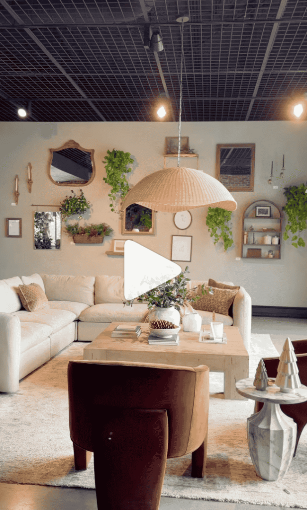 In the living room display, a large sectional sofa sits around a pale wooden coffee table, with rust-colored accent chairs adding depth and warmth. The walls are filled with art, mirrors, and trailing plants, creating a gallery that feels curated over time. On the table, a mix of books, ceramics, and greenery strikes that signature Magnolia balance between “styled” and “lived-in.”